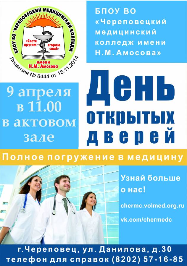 Приглашаем вас на День открытых дверей в БПОУ ВО «Череповецкий медицинский колледж имени Н.М. Амосова» 9 апреля в 11.00!